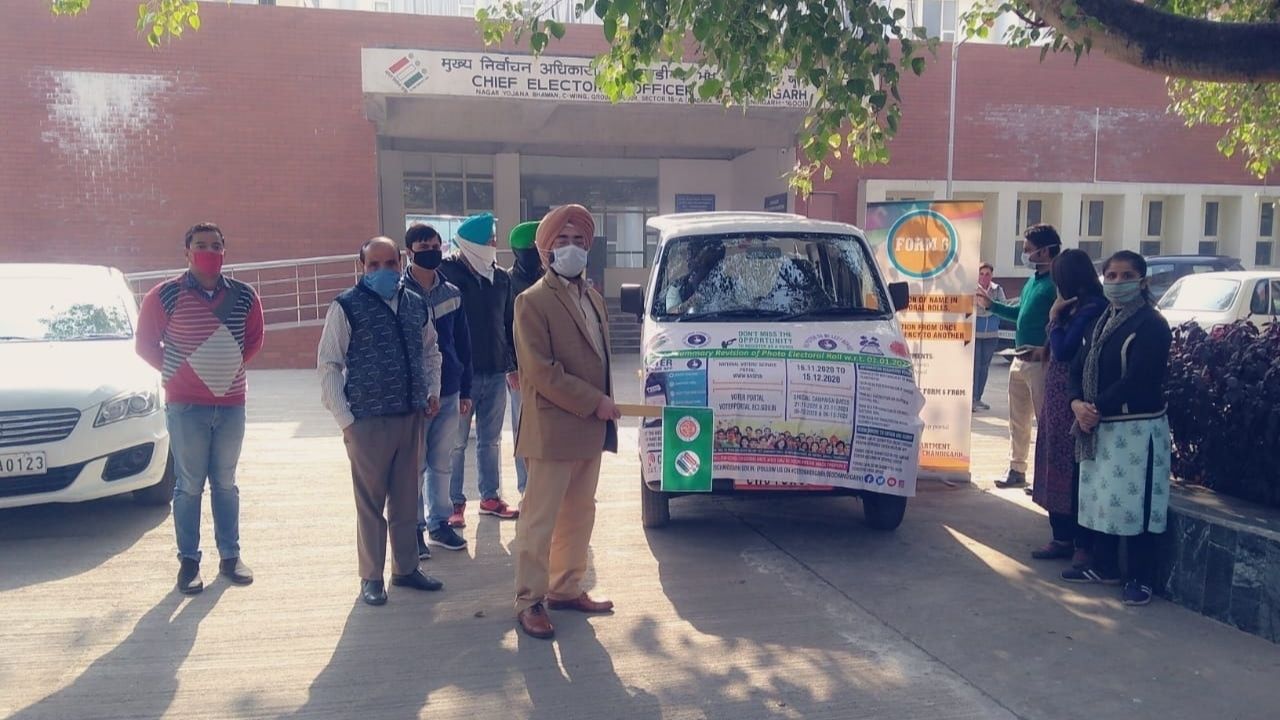 This is for the information of the General Public and the Political Parties of Chandigarh Parliamentary Constituency that during this Special Summary Revision of Photo Electoral Roll-2021, an awareness vehicle prepared under the SVEEP programme was flagged off by Sh.Jagjit Singh, PCS, Joint Chief Electoral Officer, U.T., Chandigarh. This vehicle will cover whole area of Chandigarh and give vide publicity to the programme of Special Summary Revision of Photo Electoral Roll-2021, so that the maximum number of residents can enroll themselves in the Electoral Roll of Chandigarh Parliamentary Constituency. The Joint Chief Electoral Officer also requested all the residents of Chandigarh who have completed 18 years of age to enroll themselves. The official present in the vehicle will distribute/receive forms to/from the public.