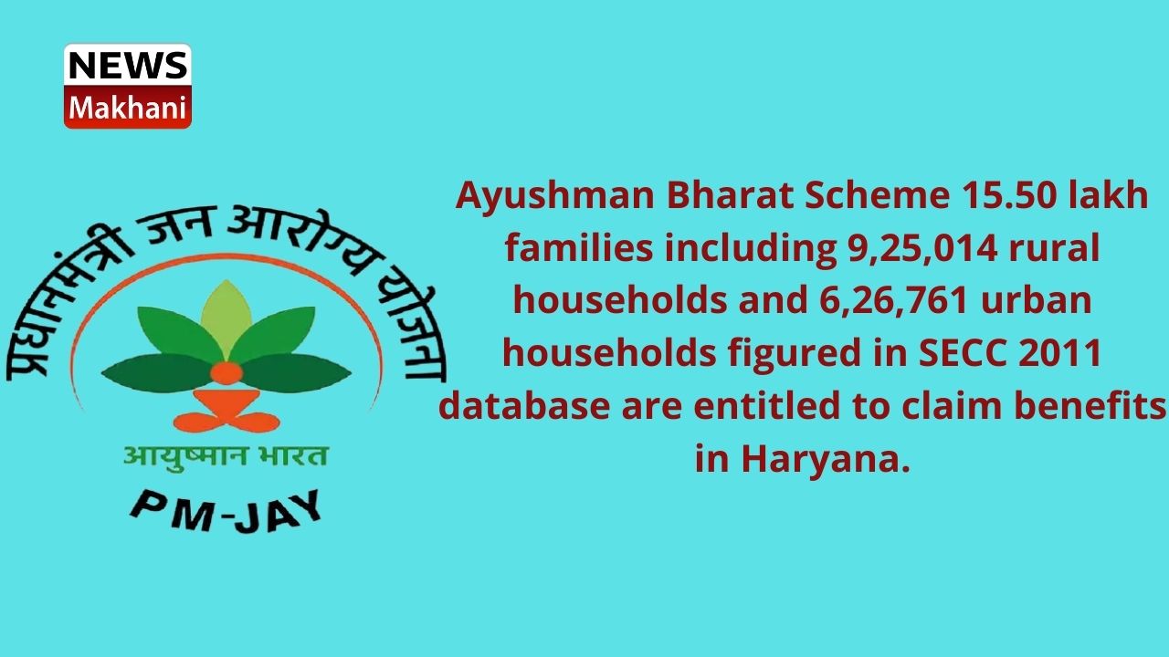 Chandigarh, June 10: Under the Ayushman Bharat Scheme 15.50 lakh families including 9,25,014 rural households and 6,26,761 urban households figured in SECC 2011 database are entitled to claim benefits in Haryana.