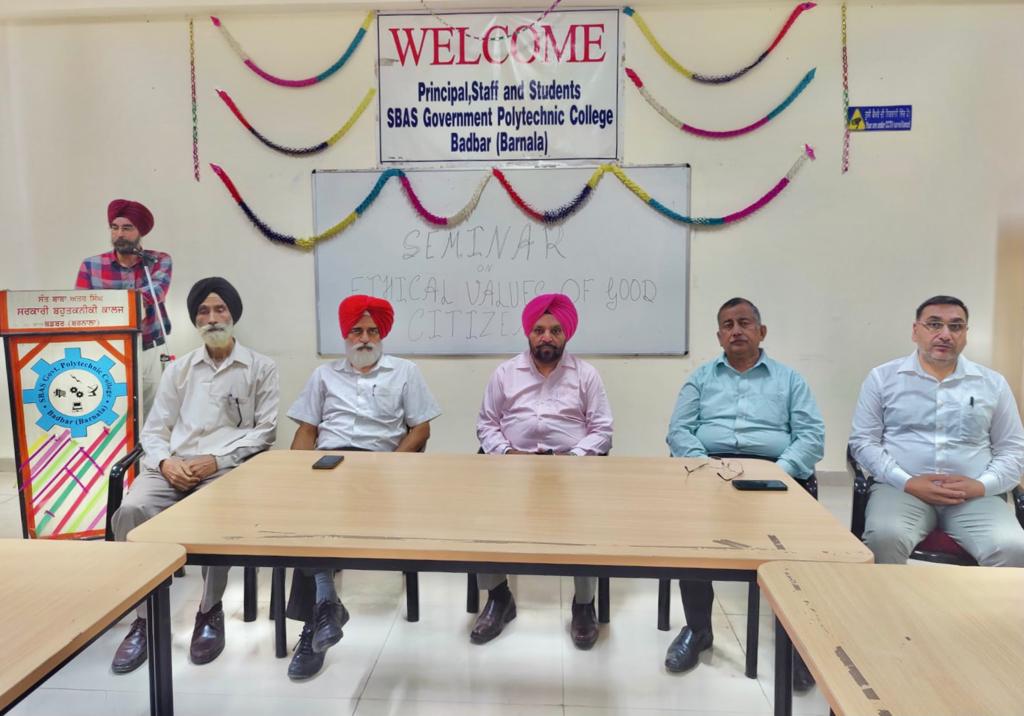 ਸੰਤ ਬਾਬਾ ਅਤਰ ਸਿੰਘ ਸਰਕਾਰੀ ਪਾਲੀਟੈਕਨਿਕ ਕਾਲਜ, ਬਡਬਰ (ਬਰਨਾਲਾ) ਵਿਖੇ ਪਿ੍ਰੰਸੀਪਲ ਯਾਦਵਿੰਦਰ ਸਿੰਘ ਦੀ ਅਗਵਾਈ ਵਿੱਚ ਜ਼ਿੰਮੇਵਾਰ ਨਾਗਰਿਕ ਵਜੋਂ ਸਮਾਜਿਕ ਕਦਰਾਂ ਕੀਮਤਾਂ ਸਬੰਧੀ ਸੈਮੀਨਾਰ ਕੀਤਾ ਗਿਆ, ਜਿਸ ਵਿੱਚ ਕਾਲਜ ਦੇ ਸਿਵਲ ਇੰਜੀ: ਅਤੇ ਮਕੈਨੀਕਲ ਇੰਜੀ: ਦੇ ਆਖਰੀ ਸਾਲ ਦੇ ਤਕਰੀਬਨ 100 ਵਿਦਿਆਰਥੀ ਸ਼ਾਮਿਲ ਹੋਏ।