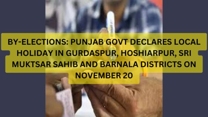 ਜ਼ਿਮਨੀ ਚੋਣਾਂ: ਪੰਜਾਬ ਸਰਕਾਰ ਵੱਲੋਂ 20 ਨਵੰਬਰ ਨੂੰ ਗੁਰਦਾਸਪੁਰ, ਹੁਸ਼ਿਆਰਪੁਰ, ਸ੍ਰੀ ਮੁਕਤਸਰ ਸਾਹਿਬ ਅਤੇ ਬਰਨਾਲਾ ਜ਼ਿਲ੍ਹਿਆਂ ਵਿੱਚ ਸਥਾਨਕ ਛੁੱਟੀ ਦਾ ਐਲਾਨ