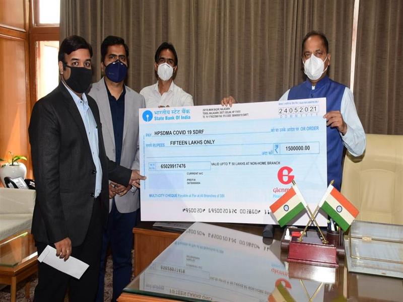 Chief Minister Jai Ram Thakur being presented a cheque of Rs.15 lakh towards Chief Minister Covid-19 Solidarity Response Fund at Shimla today.