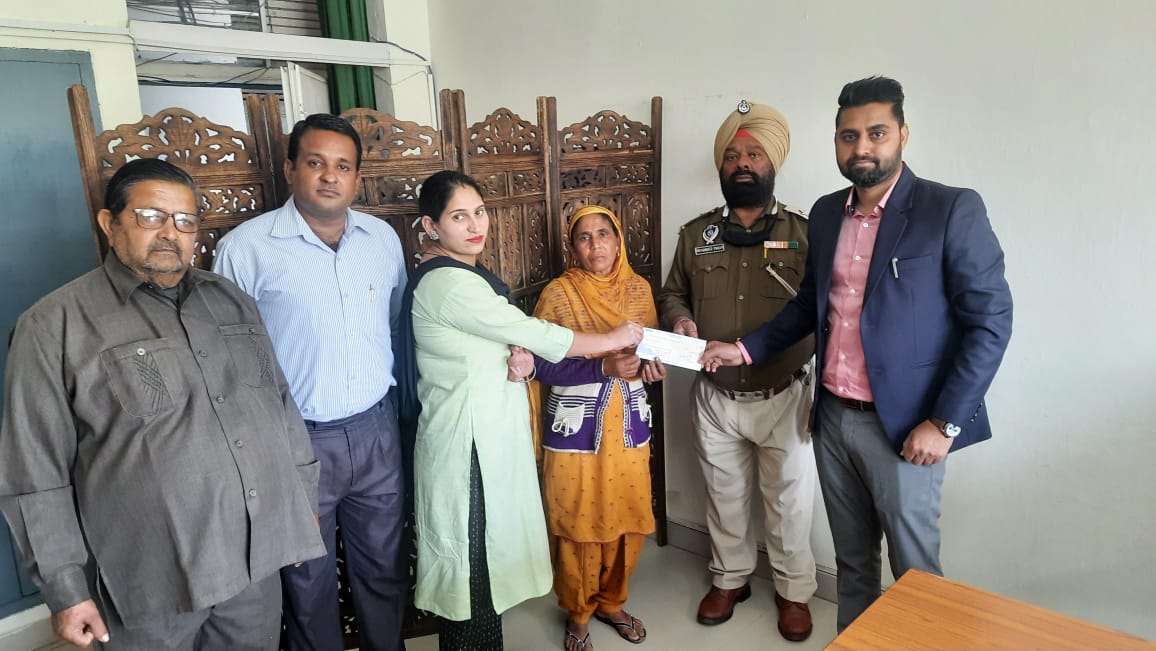 ਕਮਾਂਡੈਂਟ ਜਨਰਲ ਪੰਜਾਬ ਹੋਮ ਗਾਰਡਜ ਅਤੇ ਡਾਇਰੈਕਟਰ ਸਿਵਲ ਡਿਫੈਂਸ ਪੰਜਾਬ ਚੰਡੀਗੜ ਸ੍ਰੀ ਕੇ.ਐਸ. ਘੁੰਮਣ ਅਤੇ ਸ੍ਰੀ ਹਰਮਨਜੀਤ ਸਿੰਘ ਡਿਪਟੀ ਕਮਾਂਡੈਂਟ ਜਰਨਲ ਪੰਜਾਬ ਹੋਮ ਗਾਰਡਜ਼ ਅਤੇ ਡਿਪਟੀ ਡਾਇਰੈਕਟਰ ਸਿਵਲ ਡਿਫੈਂਸ ਪੰਜਾਬ ਚੰਡੀਗੜ ਜੀ ਦੇ ਦਿਸ਼ਾ ਨਿਰਦੇਸ਼ਾਂ ਤਹਿਤ ਸ੍ਰੀ ਲਖਵੀਰ ਸਿੰਘ ਐਡਮਨ ਅਫਸਰ ਵਲੋਂ ਜ਼ਿਲ੍ਹਾ ਮੁੱਖ ਦਫਤਰ ਰੂਪਨਗਰ ਵਿਖੇ ਡਿਊਟੀ ਦੋਰਾਨ ਮ੍ਰਿਤਕ ਜਵਾਨ ਸ੍ਰੀ ਸੁਲਤਾਜ ਕੁਮਾਰ ਦੀ ਪਤਨੀ ਗੁਰਨਾਮ ਕੌਰ ਪਿੰਡ ਬ੍ਰਹਮਪੁਰ ਜ਼ਿਲ੍ਹਾ ਰੂਪਨਗਰ ਨੂੰ ਤੀਹ ਲੱਖ ਰੁਪੈ ਦੀ ਬੀਮਾ ਰਾਸ਼ੀ ਦਾ ਚੈੱਕ ਸਪੁਰਦ ਕੀਤਾ ਗਿਆ।