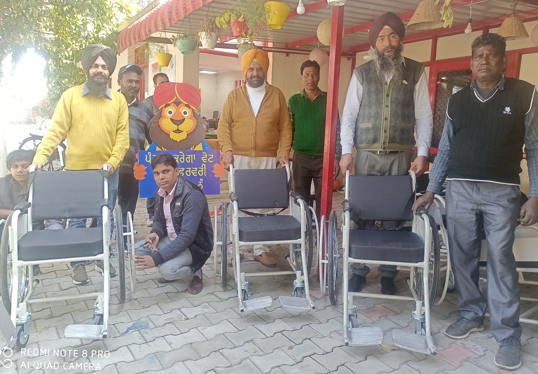 ਤਸਵੀਰ- ਸਰਬੱਤ ਦਾ ਭਲਾ ਟਰੱਸਟ ਵੱਲੋਂ ਪ੍ਰਦਾਨ ਕੀਤੀਆਂ ਗਈਆਂ ਵੀਲ੍ਹ ਚੇਅਰਜ਼ ਨੂੰ ਪੋਲਿੰਗ ਸਟੇਸ਼ਨ ਵੱਲ ਭੇਜਣ ਮੌਕੇ ਡੀਐਸਐਸਓ ਵਰਿੰਦਰ ਸਿੰਘ ਟਿਵਾਣਾ, ਪ੍ਰੋ. ਗੁਰਬਖਸ਼ੀਸ਼ ਸਿੰਘ ਅੰਟਾਲ ਤੇ ਹੋਰ ਮੁਲਾਜ਼ਮ।