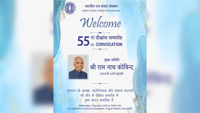 The 55th Convocation ceremony of the Indian Institute of Mass Communication (IIMC) will be held Pragati Maidan’s Bharat Mandap on January 10, 2024. The former President of India, Shri Ram Nath Kovind, will be the chief guest at the event and give the Convocation address. The ceremony will also be attended by the Chairman of IIMC, Shri R Jagannathan, and the Director General, Dr. Anupama Bhatnagar.