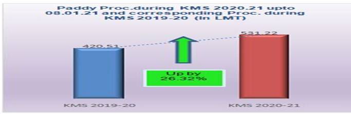 In Kharif Marketing Season (KMS) 2020-21, Government continues to procure Kharif 2020-21 crops at MSP from farmers as per existing MSP Schemes. Paddy procurement for Kharif 2020-21 is continuing smoothly in the procuring States & UTs of Punjab, Haryana, Uttar Pradesh, Telangana, Uttarakhand, Tamil Nadu, Chandigarh, Jammu & Kashmir, Kerala, Gujarat, Andhra Pradesh, Chhattisgarh, Odisha, Madhya Pradesh, Maharashtra, Bihar, Jharkhand, Assam,Karnataka and West Bengal with purchase of over 531.22 LMTs of paddy up to 08.01.2021.This is an increase of 26.32% against the last year corresponding purchase of 420.51 LMT. Out of the total purchase of 531.22 LMT, Punjab alone has contributed 202.77 LMT which is 38.17% of total procurement. About 70.35 Lac farmers have already been benefitted from the ongoing KMS procurement Operations with MSP value of Rs100294.26 Crore. Based on the proposal from the States, approval was accorded for procurement of 51.66 LMT of Pulse and Oilseeds of Kharif Marketing Season 2020 for the States of Tamil Nadu, Karnataka, Maharashtra, Telangana, Gujarat, Haryana, Uttar Pradesh, Odisha, Rajasthan and Andhra Pradesh under Price Support Scheme (PSS). Further, sanction for procurement of 1.23 LMT of Copra (the perennial crop) for the States of Andhra Pradesh, Karnataka, Tamil Nadu and Kerala was also given. Also, sanction for procurement of 2.50 LMT of Pulse and Oilseeds of Rabi Marketing Season 2020-2021 for the States of Gujarat and Tamil Nadu, was given.  For other States/UTs, approval will also be accorded on receipt of proposals for procurement of Pulses, Oilseeds and Copra under PSS so that procurement of FAQ grade of these crops can be made at notified MSP for the year 2020-21 directly from the registered farmers, if the market rate goes below MSP during the notified harvesting period in the respective States/UTs by the Central Nodal Agencies through State nominated procuring agencies.
