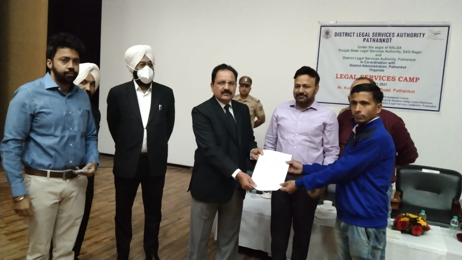 ਜਿਲ੍ਹਾ ਕਾਨੂੰਨੀ ਸੇਵਾਵਾਂ ਅਥਾਰਟੀ ਪਠਾਨਕੋਟ ਵੱਲੋਂ ਲੀਗਲ ਸਰਵਿਸ ਦਿਵਸ ਮੌਕੇ ਆਡੀਟੋਰੀਅਮ ਪਠਾਨਕੋਟ ਵਿਖੇ ਜਿਲ੍ਹਾ ਤੇ ਸੈਸਨ ਜੱਜ ਪਠਾਨਕੋਟ –ਕਮ-ਚੇਅਰਮੈਨ ਜਿਲ੍ਹਾ ਕਾਨੂੰਨੀ ਸੇਵਾਵਾਂ ਅਥਾਰਟੀ ਪਠਾਨਕੋਟ ਸ੍ਰੀ ਮੁਹੰਮਦ ਗੁਲਜਾਰ ਦੀ ਪ੍ਰਧਾਨਗੀ ਹੇਠ ਜਨ ਸੁਵਿਧਾ ਕੈਂਪ ਲਗਾਇਆ ਗਿਆ। ਜਿਸ ਵਿੱਚ ਸਮਾਜਿਕ ਸੁਰੱਖਿਆ ਵਿਭਾਗ, ਇਸਤਰੀ ਤੇ ਬਾਲ ਵਿਕਾਸ ਵਿਭਾਗ, ਕਿਰਤ ਵਿਭਾਗ, ਕਾਰਪੋਰੇਟ ਵਿਭਾਗ, ਬਿਜਲੀ ਵਿਭਾਗ, ਮਾਲ ਵਿਭਾਗ ਅਤੇ ਹੋਰ ਵਿਭਾਗਾਂ ਦੇ ਅਧਿਕਾਰੀਆਂ ਨੇ ਵੀ ਭਾਗ ਲਿਆ।