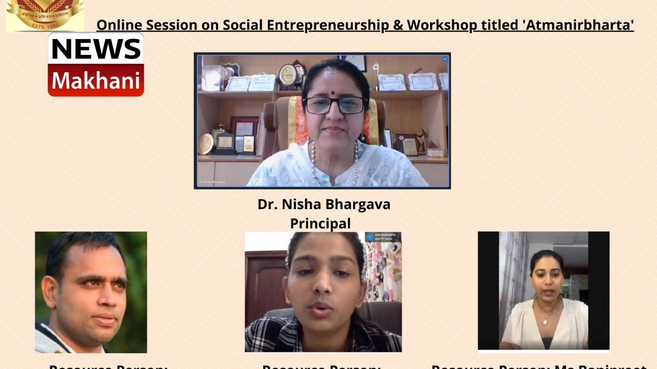 The Institution Innovation Council (IIC) of Mehr Chand Mahajan DAV College for Women organised an awareness session on ‘Social Entrepreneurship’ and a workshop titled ‘Atmanirbharta: An Entrepreneurial Journey’. Dr. Arun Bansal, Administrator, Social Substance conducted the session on Social Entrepreneurship, wherein he dwelt upon the basics of social entrepreneurship and discussed the importance of aligning business goals, business model target audience and supply chain of various services with sustainability. He also discussed case studies on some recent social contributions towards a sustainable environment. The workshop ‘Atmanirbharta’ was conducted by Ms. Alisha Gupta, Bakecstasy and Ms. Banipreet Kaur, BakeShop by Bani and witnessed participation of over 200 faculty and students. The session was an endeavour to acquaint the participants with the efforts undertaken by an entrepreneur to start a successful venture. Both Ms. Alisha and Ms. Banipreet shared the story of their respective entrepreneurial journeys, emphasising that hard work, skill, risk-taking ability, creativity, connectivity and execution-oriented planning are the essential attributes for an entrepreneur to build a successful startup.