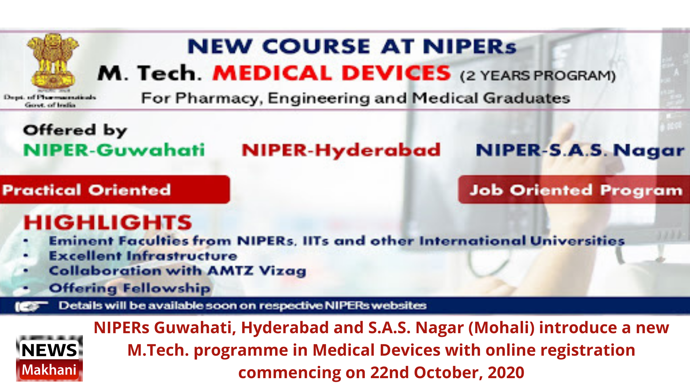 NIPERs Guwahati, Hyderabad and S.A.S. Nagar (Mohali) introduce a new M.Tech. programme in Medical Devices with online registration commencing on 22nd October, 2020