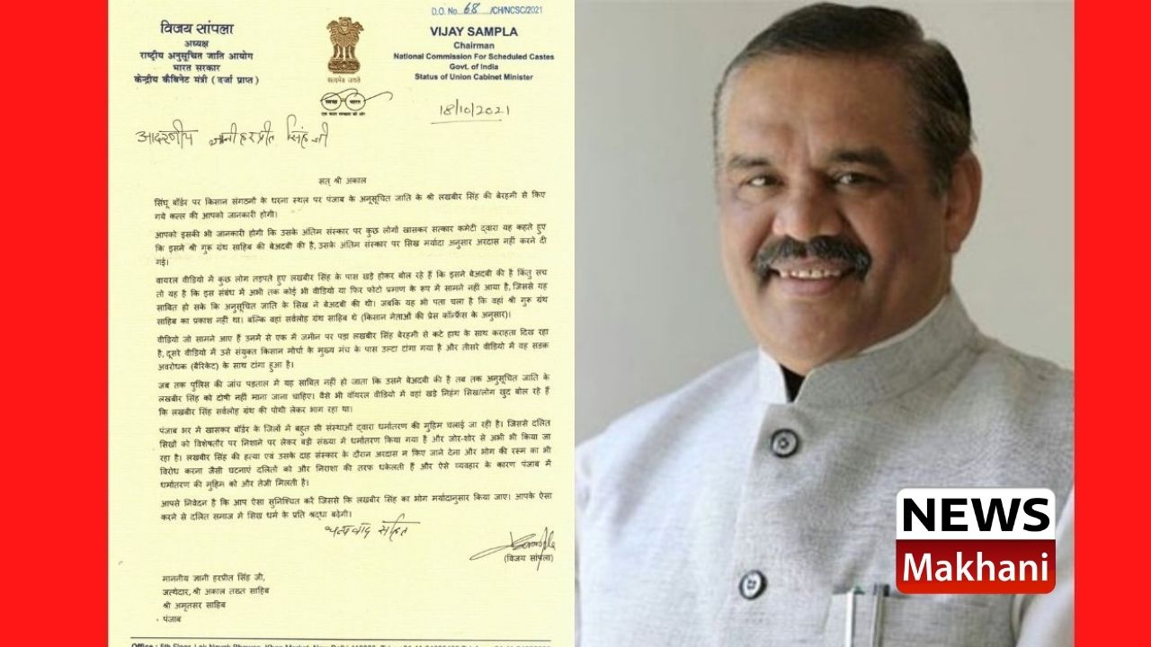 ਚੰਡੀਗੜ, 18 ਅਕਤੂਬਰ– ਨੈਸ਼ਨਲ ਐਸਸੀ ਕਮਿਸ਼ਨ ਦੇ ਚੇਅਰਮੈਨ ਵਿਜੈ ਸਾਂਪਲਾ ਨੇ ਸ਼੍ਰੀ ਅਕਾਲ ਤਖ਼ਤ ਸਾਹਿਬ ਦੇ ਜੱਥੇਦਾਰ ਗਿਆਨੀ ਹਰਪ੍ਰੀਤ ਸਿੰਘ ਨੂੰ ਪੱਤਰ ਲਿਖ ਕੇ ਬੇਨਤੀ ਕੀਤੀ ਹੈ ਕਿ ਸਿੰਘੂ ਬਾਰਡਰ ’ਤੇ ਕਿਸਾਨ ਸੰਗਠਨਾਂ ਦੇ ਅੰਦੋਲਨ ਵਾਲੀ ਥਾਂ ’ਤੇ ਬੇਰਹਿਮੀ ਨਾਲ ਕਤਲ ਕੀਤੇ ਗਏ ਅਨੁਸੂਚਿਤ ਜਾਤੀ ਦੇ ਲਖਬੀਰ ਸਿੰਘ ਦਾ ਭੋਗ ਸਿੱਖ ਧਰਮ ਮੁਤਾਬਿਕ ਕਰਵਾਇਆ ਜਾਵੇ।