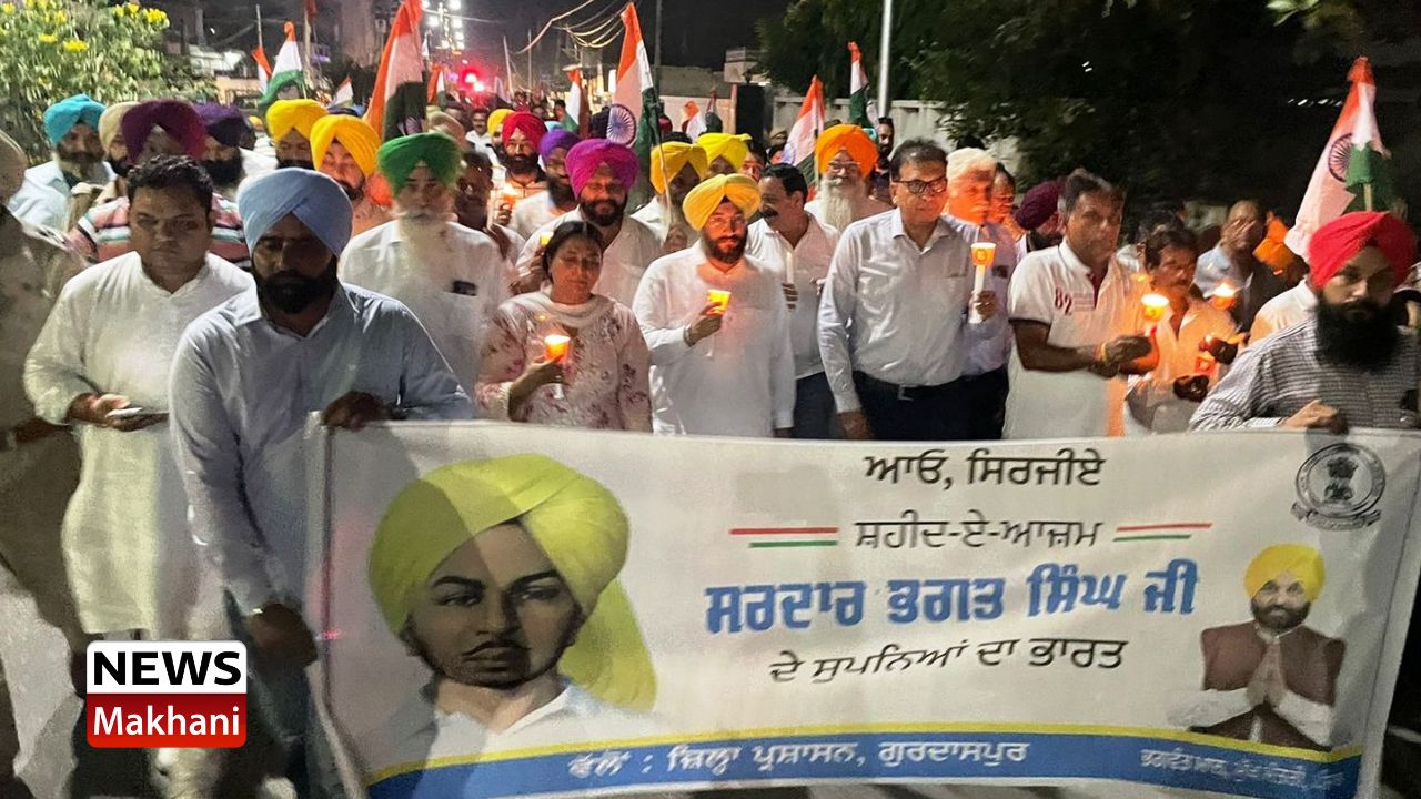 ਗੁਰਦਾਸਪੁਰ, 28 ਸਤੰਬਰ ( ) – ਸ਼ਹੀਦ-ਏ-ਆਜ਼ਮ ਸ. ਭਗਤ ਸਿੰਘ ਦੀ 115ਵੀਂ ਜਨਮ ਵਰ੍ਹੇਗੰਢ ਮੌਕੇ ਜ਼ਿਲ੍ਹਾ ਪ੍ਰਸ਼ਾਸਨ ਵੱਲੋਂ ਅੱਜ ਸ਼ਾਮ 7 ਵਜੇ ਸਥਾਨਕ ਪੰਚਾਇਤ ਭਵਨ ਤੋਂ ਜਹਾਜ ਚੌਂਕ ਤੱਕ ਕੈਂਡਿਲ ਲਾਈਟ ਮਾਰਚ ਦਾ ਆਯੋਜਿਨ ਕੀਤਾ ਗਿਆ। ਡਿਪਟੀ ਕਮਿਸ਼ਨਰ ਜਨਾਬ ਮੁਹੰਮਦ ਇਸ਼ਫ਼ਾਕ ਦੀ ਅਗਵਾਈ ਹੇਠ ਵਧੀਕ ਡਿਪਟੀ ਕਮਿਸ਼ਨਰ (ਜ) ਡਾ. ਨਿਧੀ ਕੁਮੁਦ, ਵਧੀਕ ਡਿਪਟੀ ਕਮਿਸ਼ਨਰ ਵਿਕਾਸ ਸ੍ਰੀਮਤੀ ਪਰਮਜੀਤ ਕੌਰ, ਐੱਸ.ਡੀ.ਐੱਮ. ਗੁਰਦਾਸਪੁਰ ਸ੍ਰੀਮਤੀ ਅਮਨਦੀਪ ਕੌਰ, ਸਹਾਇਕ ਕਮਿਸ਼ਨਰ (ਜ) ਡਾ. ਅਰੁਨ ਕੁਮਾਰ, ਤਹਿਸੀਲਦਾਰ ਸ੍ਰੀ ਜਗਤਾਰ ਸਿੰਘ ਸਮੇਤ ਸਮੂਹ ਜ਼ਿਲ੍ਹਾ ਅਧਿਕਾਰੀਆਂ, ਕਰਮਚਾਰੀਆਂ, ਸਮਾਜ ਸੇਵੀ ਸੰਸਥਾਵਾਂ ਦੇ ਨੁਮਾਇੰਦਿਆਂ ਤੋਂ ਇਲਾਵਾ ਵੱਖ-ਵੱਖ ਰਾਜਨੀਤਿਕ ਪਾਰਟੀਆਂ ਦੇ ਆਗੂ ਜਿਨ੍ਹਾਂ ਵਿੱਚ ਆਮ ਆਦਮੀ ਪਾਾਰਟੀ ਦੇ ਜ਼ਿਲ੍ਹਾ ਇੰਚਾਰਜ ਸ. ਜਗਰੂਪ ਸਿੰਘ ਸੇਖਵਾਂ ਅਤੇ ਵੱਡੀ ਗਿਣਤੀ ਵਿੱਚ ਸ਼ਹਿਰ ਵਾਸੀਆਂ ਨੇ ਇਸ ਕੈਂਡਿਲ ਮਾਰਚ ਵਿੱਚ ਹਿੱਸਾ ਲਿਆ।