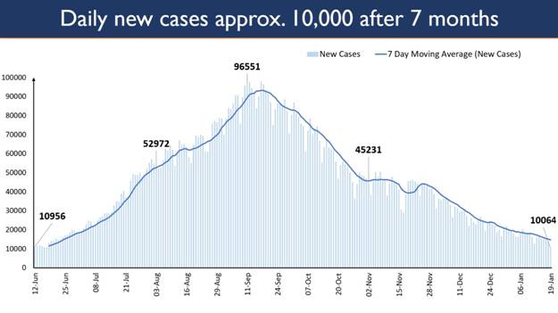 Positivity rate has also seen a deep dip with the increase in number of testing infrastructure. India’s weekly positivity rate is 1.97%. 22 States/UTs have weekly positivity rate less than the national average.13 States/UTs have weekly positivity rate more than the national average. The country has gotten less than 140 fatalities (137 fatalities) in the last 24 hours after approximately 8 months. India’s Recovery Rate has past 96.66%. The total number of recoveries has touched 1,02,28,753 while the number of Active Cases in the country stands at 2,08,012 and 17,411 recoveries have been registered in the last 24 hours in the country. 80.41% of the new recovered cases are observed from Ten States/UTs. Kerala has reported the highest number of recoveries with 3,921 newly recovered cases in single day. 3,854 people recovered in Maharashtra in the past 24 hours followed by 1,301 in Chhattisgarh. 71.76% of the new cases are from Six States and UTs. Kerala continues to report the highest number of daily new cases at 3,346. It is followed by Maharashtra and Tamil Nadu with 1,924 and 551 new cases. 8 States & UTs has reported 72.99% of the total fatalities happened in the last 24 hours. Maharashtra has reported 35 deaths. Kerala also saw a fatality count of 17 while in West Bengal 10 new deaths.