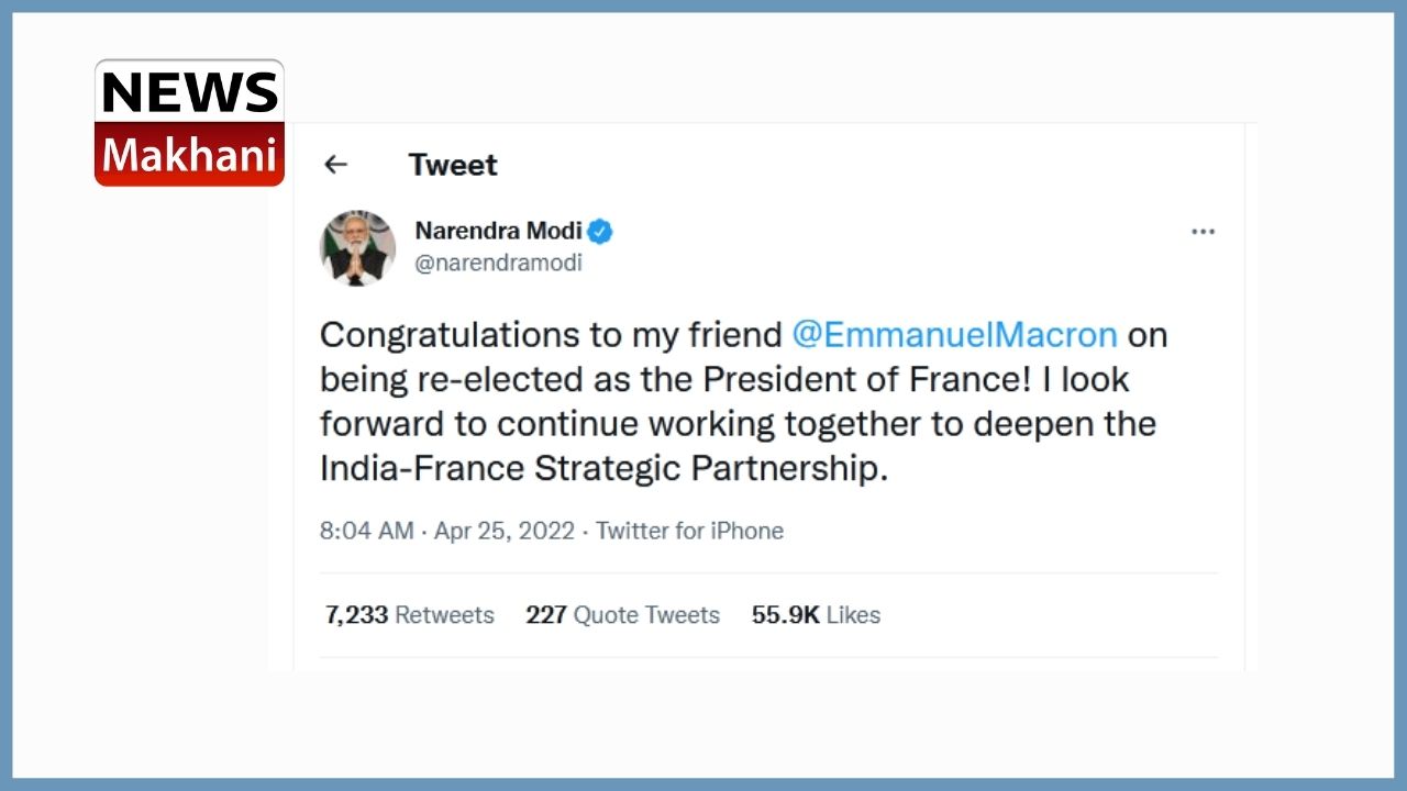 The Prime Minister, Shri Narendra Modi has congratulated Emmanuel Macron on being re-elected as the President of France.