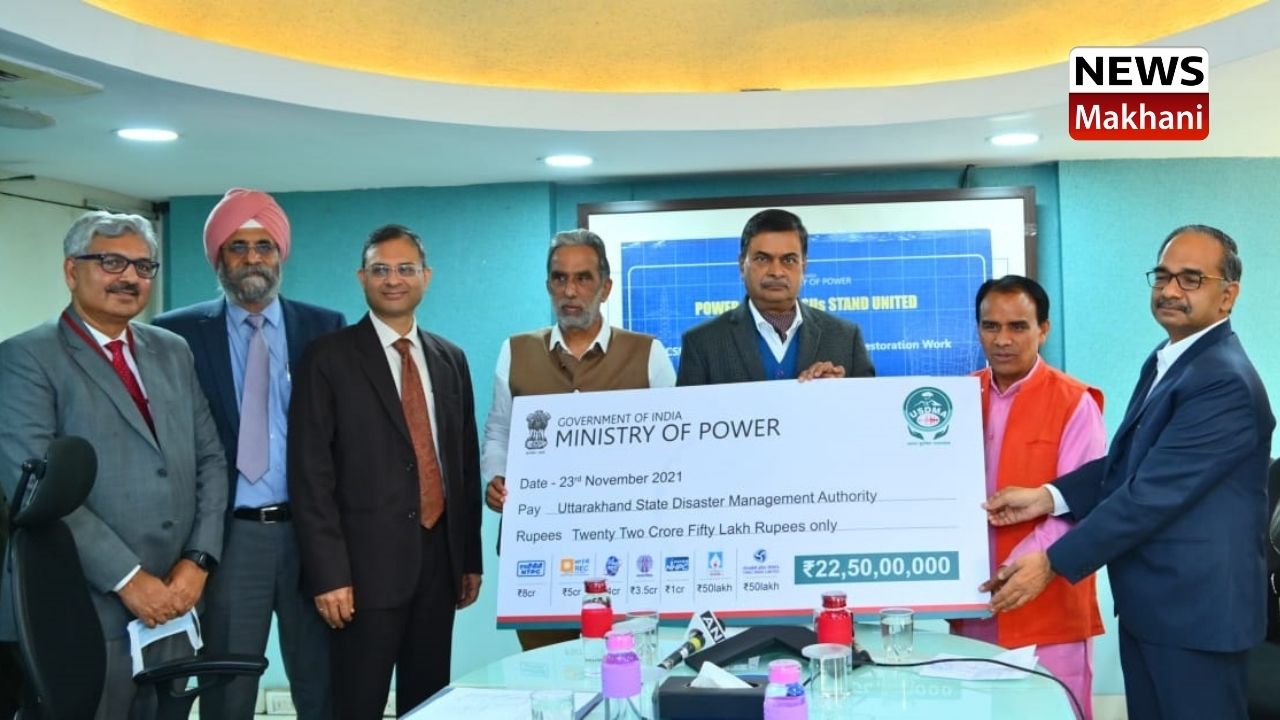 Union Minister of Power Shri R.K Singh today presented a cheque of Rs 22.5 Crores to Uttarakhand Minister of Disaster Management Shri D S Rawat here with virtual presence of Chief Minister of Uttarakhand Shri Pushkar Singh Dhami .