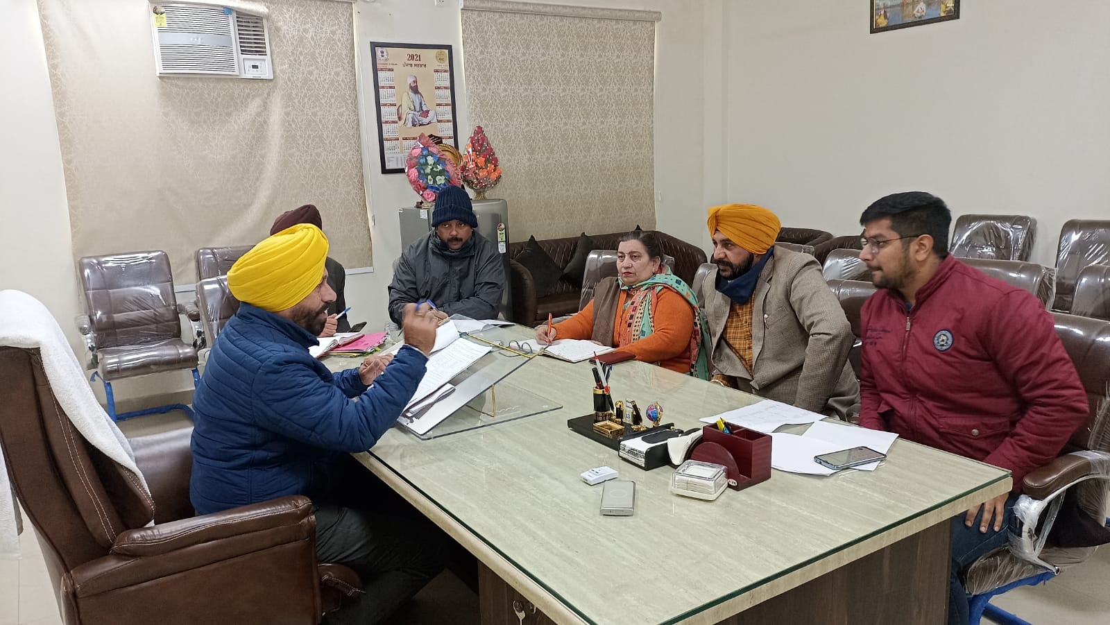 ਕੈਪਸ਼ਨ: ਸ਼੍ਰ: ਰਾਜ ਕੰਵਲਪ੍ਰੀਤ ਪਾਲ ਸਿੰਘ ਚੇਅਰਮੈਨ, ਜ਼ਿਲ੍ਹਾ ਯੋਜਨਾ ਕਮੇਟੀ ਂ ਸਹਾਇਕ ਲੇਬਰ ਕਮਿਸ਼ਨਰ ਸ੍ਰ: ਸੰਤੋਖ ਸਿੰਘ ਨਾਲ ਕਿਰਤੀਆਂ ਦੀ ਭਲਾਈ ਸਬੰਧੀ ਚੱਲ ਰਹੀਆਂ ਸਕੀਮਾਂ ਦੀ ਮੀਟਿੰਗ ਕਰਦੇ ਹੋਏ।