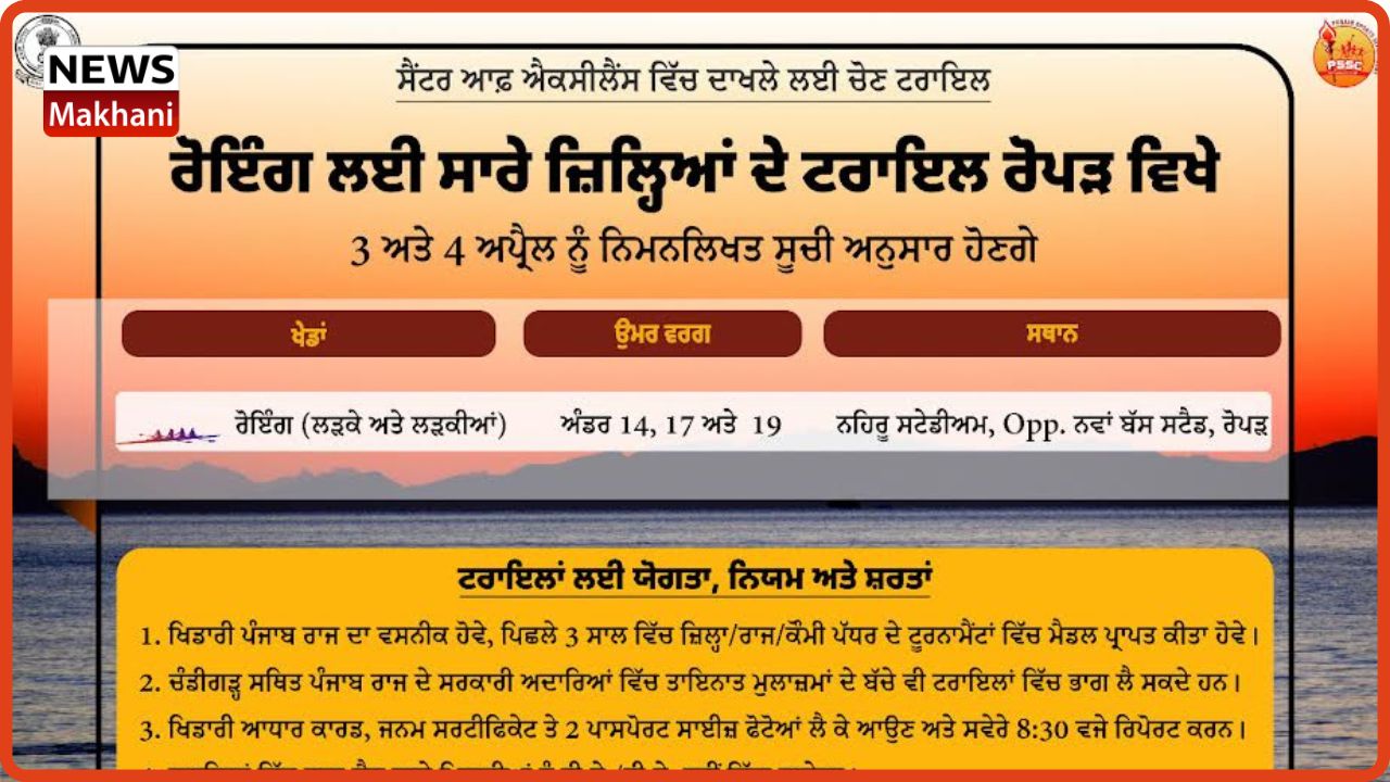 ਰੂਪਨਗਰ, 29 ਮਾਰਚ : ਪੰਜਾਬ ਇੰਸਟੀਚਿਊਟ ਆਫ਼ ਸਪੋਰਟਸ ਦੇ ਰੈਜੀਡੈਂਸ਼ਲ ਖੇਡ ਵਿੰਗਾਂ ਲਈ ਖਿਡਾਰੀਆਂ ਦੀ ਚੋਣ ਵਾਸਤੇ ਟਰਾਇਲ 3 ਅਪਰੈਲ ਤੋਂ 25 ਅਪਰੈਲ ਤੱਕ ਲਏ ਜਾ ਰਹੇ ਹਨ। ਇਸ ਸੰਬੰਧੀ ਜਾਣਕਾਰੀ ਦਿੰਦਿਆਂ ਡਿਪਟੀ ਕਮਿਸ਼ਨਰ ਡਾ. ਪ੍ਰੀਤੀ ਯਾਦਵ ਨੇ ਦੱਸਿਆ ਕਿ ਰੋਇੰਗ ਖੇਡ ਲਈ ਲੜਕੇ ਤੇ ਲੜਕੀਆਂ ਅੰਡਰ 14, 17 ਅਤੇ 19 ਉਮਰ ਵਰਗ ਦੇ ਖਿਡਾਰੀਆਂ ਦੇ ਟਰਾਇਲ ਰੂਪਨਗਰ ਦੇ ਨਹਿਰੂ ਸਟੇਡੀਅਮ ਵਿਖੇ 3 ਤੇ 4 ਅਪਰੈਲ ਨੂੰ ਲਏ ਜਾਣਗੇ।