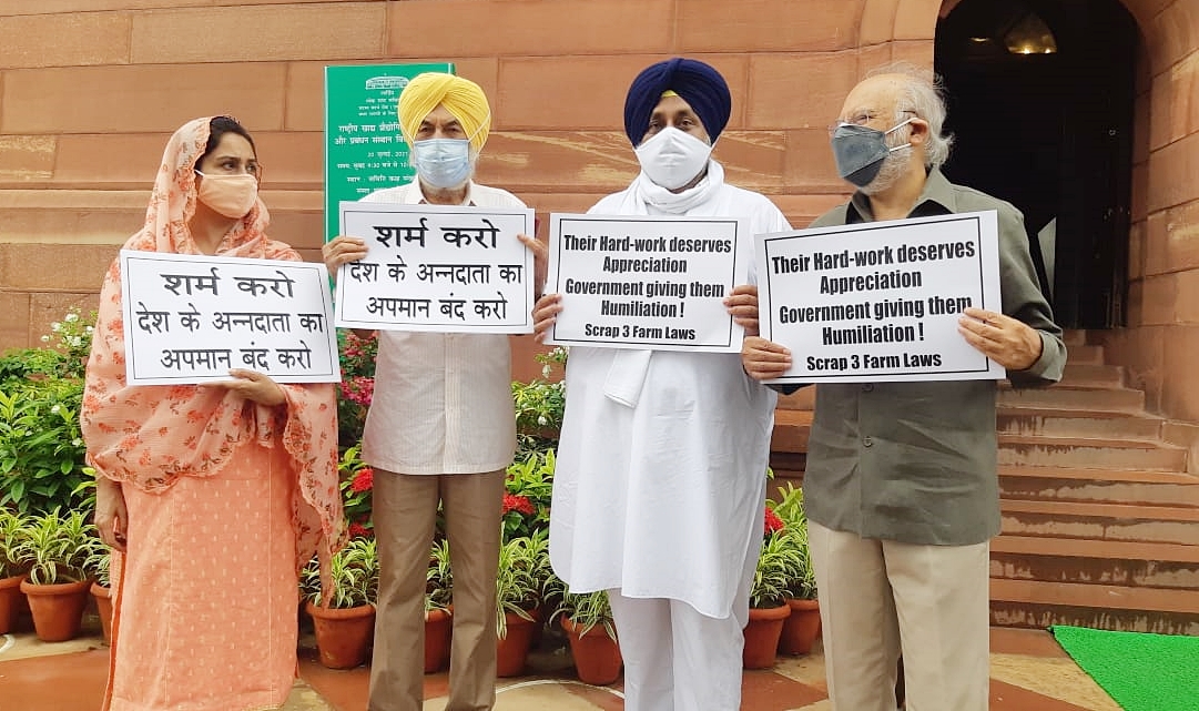 ‘ਸ਼ਰਮ ਕਰੋ, ਦੇਸ਼ ਕੇ ਅੰਨਦਾਤਾ ਕਾ ਅਪਮਾਨ ਬੰਦ ਕਰੋ’ ਵਰਗੇ ਨਾਅਰਿਆਂ ਵਾਲੀਆਂ ਤਖਤੀਆਂ ਚੁੱਕ ਕੇ ਪ੍ਰਦਰਸ਼ਨ ਕਰਦਿਆਂ ਅਕਾਲੀ ਦਲ ਤੇ ਬਸਪਾ ਦੇ ਸੰਸਦ ਮੈਂਬਰਾਂ ਜਿਹਨਾਂ ਵਿਚ ਬਸਪਾ ਦੇ ਜਨਰਲ ਸਕੱਤਰ ਸਤੀਸ਼ ਮਿਸ਼ਰਾ ਤੇ ਸਾਬਕਾ ਕੇਂਦਰੀ ਮੰਤਰੀ ਹਰਸਿਮਰਤ ਕੌਰ ਬਾਦਲ ਵੀ ਸ਼ਾਮਲ ਸਨ, ਨੇ ਕਿਹਾ ਕਿ ਐਨ ਡੀ ਏ ਸਰਕਾਰ ਨੇ ਆਪਣੇ ਭਾਰੀ ਬਹੁਮਤ ਦੀ ਦੁਰਵਰਤੋਂ ਕਰ ਕੇ ਤਿੰਨ ਖੇਤੀ ਕਾਨੁੰਨ ਰੱਦ ਕਰਨ ਦੀ ਮੰਗ ਕਰਦਾ ਕੰਮ ਰੋਕੂ ਮਤਾ ਪੇਸ਼ ਕਰਨ ਦੀ ਮਨਾਹੀ ਕਰ ਦਿੱਤੀ।
