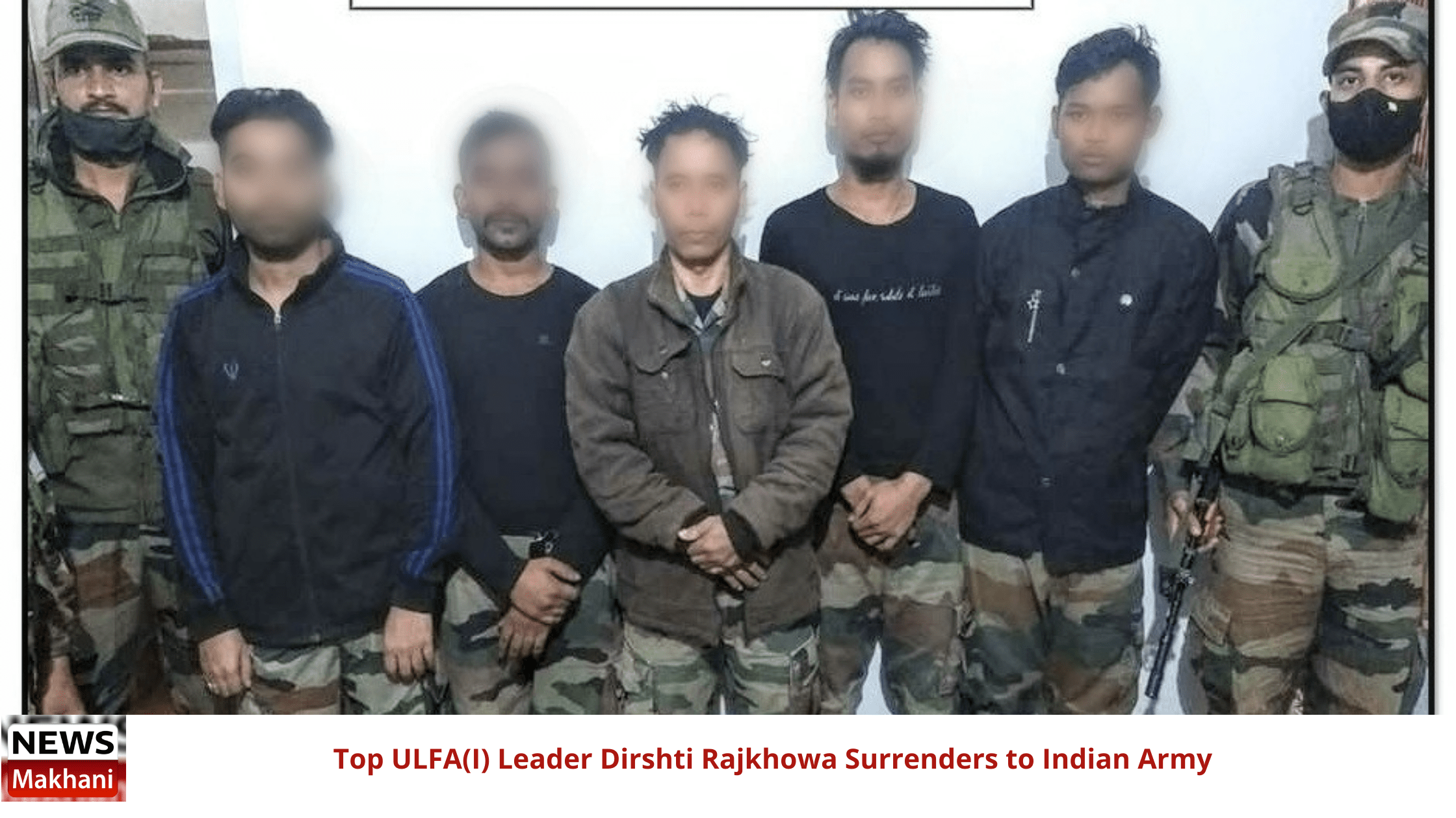 In a swift and well planned operation executed by the Indian Army Intelligence Agencies at Meghalaya-Assam- Bangladesh Border, dreaded hardcore ULFA(I) leader, SS Col Drishti Rajkhowa along with four accomplices SS Corporal Vedanta, YasinAsom, RopjyotiAsom and MithunAsom, surrendered, with a huge quantity of arms.