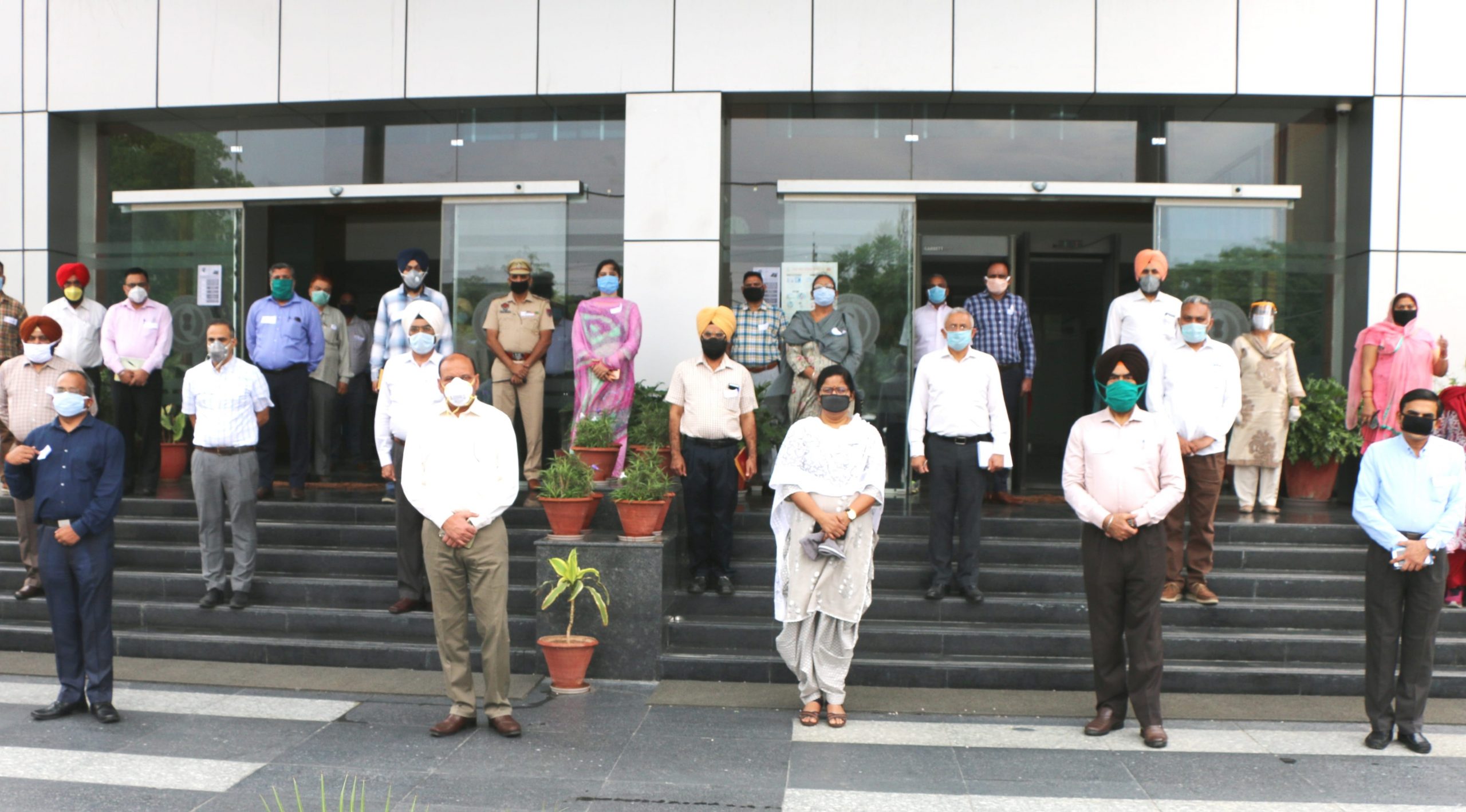 ਮੁੱਖ ਡਾਇਰੈਕਟਰ-ਕਮ- ਏਡੀਜੀਪੀ ਬੀਕੇ ਉੱਪਲ ਦੀ ਅਗਵਾਈ ਵਿੱਚ ਵਿਜੀਲੈਂਸ ਹੈੱਡਕੁਆਰਟਰ ਐਸ.ਏ.ਐਸ.ਨਗਰ ਵਿਖੇ ਅਧਿਕਾਰੀ ਅਤੇ ਕਰਮਚਾਰੀ ਐਸਆਈ ਹਰਜੀਤ ਸਿੰਘ ਦੀ ਨੇਮਪਲੇਟ ਲਗਾ ਕੇ ਇੱਕਜੁੱਟਤਾ ਜਤਾਉਂਦੇ ਹੋਏ।