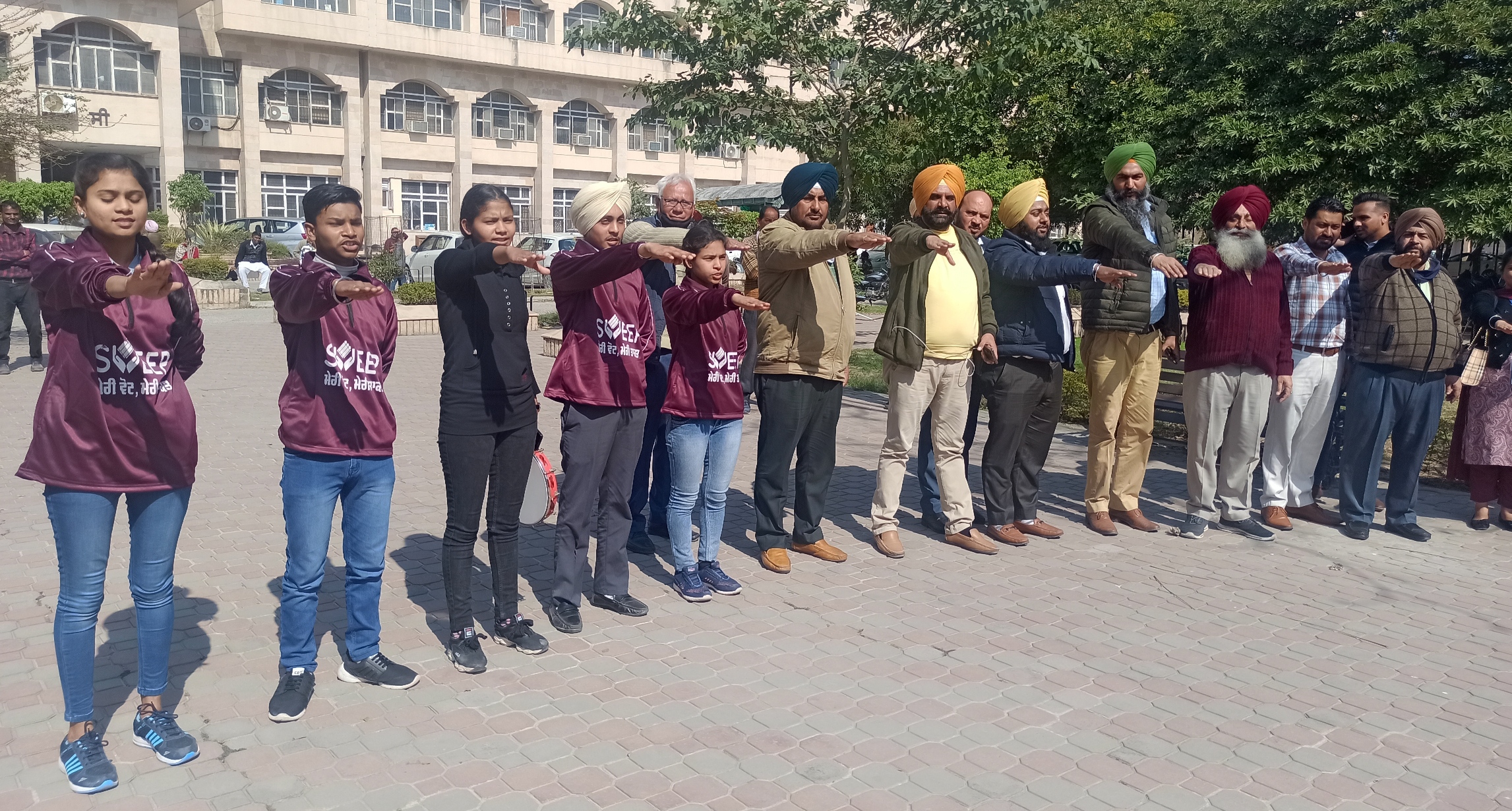 ਮਿੰਨੀ ਸਕੱਤਰੇਤ ਪਟਿਆਲਾ ਵਿਖੇ ਸਵੀਪ ਮੁਹਿੰਮ ਦੌਰਾਨ ਨੁੱਕੜ ਨਾਟਕ ਲੋਕਤੰਤਰ ਦਾ ਤਿਉਹਾਰ ਦੇ ਮੰਚਨ ਮੌਕੇ, ਸੌ ਫ਼ੀਸਦੀ ਮਤਦਾਨ ਕਰਨ ਦੀ ਸਹੁੰ ਚੁੱਕਦੇ ਹੋਏ ਕਲਾਕਾਰ ਤੇ ਦਰਸ਼ਕ।