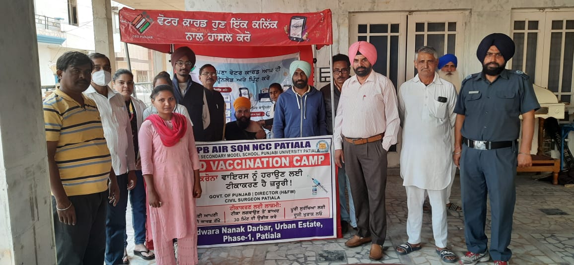 ਸੀਨੀਅਰ ਸੈਕੰਡਰੀ ਮਾਡਲ ਸਕੂਲ ਪੰਜਾਬੀ ਯੂਨੀਵਰਸਿਟੀ ਪਟਿਆਲਾ ਦੇ ਐਨ.ਸੀ.ਸੀ. ਏਅਰ ਵਿੰਗ ਵੱਲੋਂ ਜ਼ਿਲ੍ਹਾ ਸਵੀਪ ਟੀਮ ਦੇ ਸਹਿਯੋਗ ਨਾਲ ਅੱਜ 17ਵਾਂ ਟੀਕਾਕਰਨ ਕੈਂਪ ਗੁਰਦੁਆਰਾ ਨਾਨਕ ਦਰਬਾਰ ਅਰਬਨ ਅਸਟੇਟ ਪਟਿਆਲਾ ਵਿਖੇ ਲਗਾਇਆ ਗਿਆ।