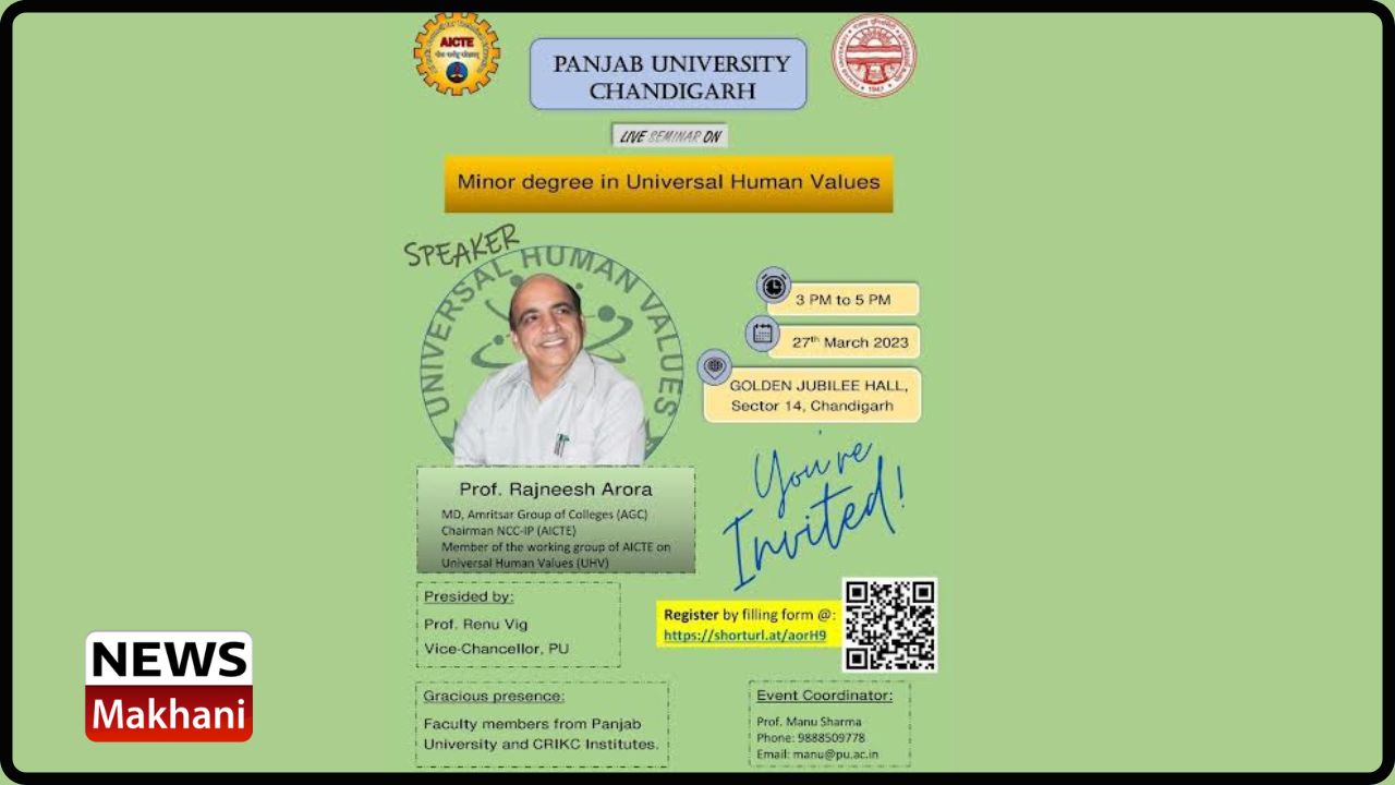 The New Education Policy-2020 (NEP-2020) specifically states that “education is fundamental for achieving full human potential, developing an equitable and just society, and promoting national development”. Keeping in mind the core objective of NEP, a special lecture is being organized in Panjab University on ‘Minor Degree in Universal Human Values’. The lecture will be delivered by Prof Rajneesh Arora, Chairman NCC-IP (AICTE) and member of the working group of AICTE on Universal Human Values. Prof Arora is MD, Amritsar Group of Colleges and is former Vice Chancellor, Punjab Technical University. The function will be presided over by Prof Renu Vig, Vice-Chancellor, Panjab University, Chandigarh.