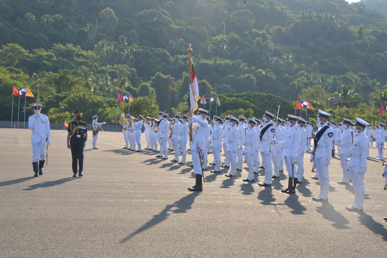 In a spectacular Passing out Parade (POP) held at Indian Naval Academy (INA), Ezhimala, on Saturday, 28 November 2020, 164 trainees comprising Midshipmen (99th INAC and INAC-NDA), Cadets of the Indian Navy (30th Naval Orientation Course Extended) and two International trainees from Sri Lanka Navy passed out with flying colours, marking the culmination of their ab-initio training. The parade was checked by General Manoj Mukund Naravane, PVSM, AVSM, SM, VSM, ADC, Chief of the Army Staff, who awarded medals to meritorious Midshipmen and Cadets on completion of the Ceremonial Review. Vice Admiral M A Hampiholi, AVSM, NM, Commandant, INA was the Conducting Officer.