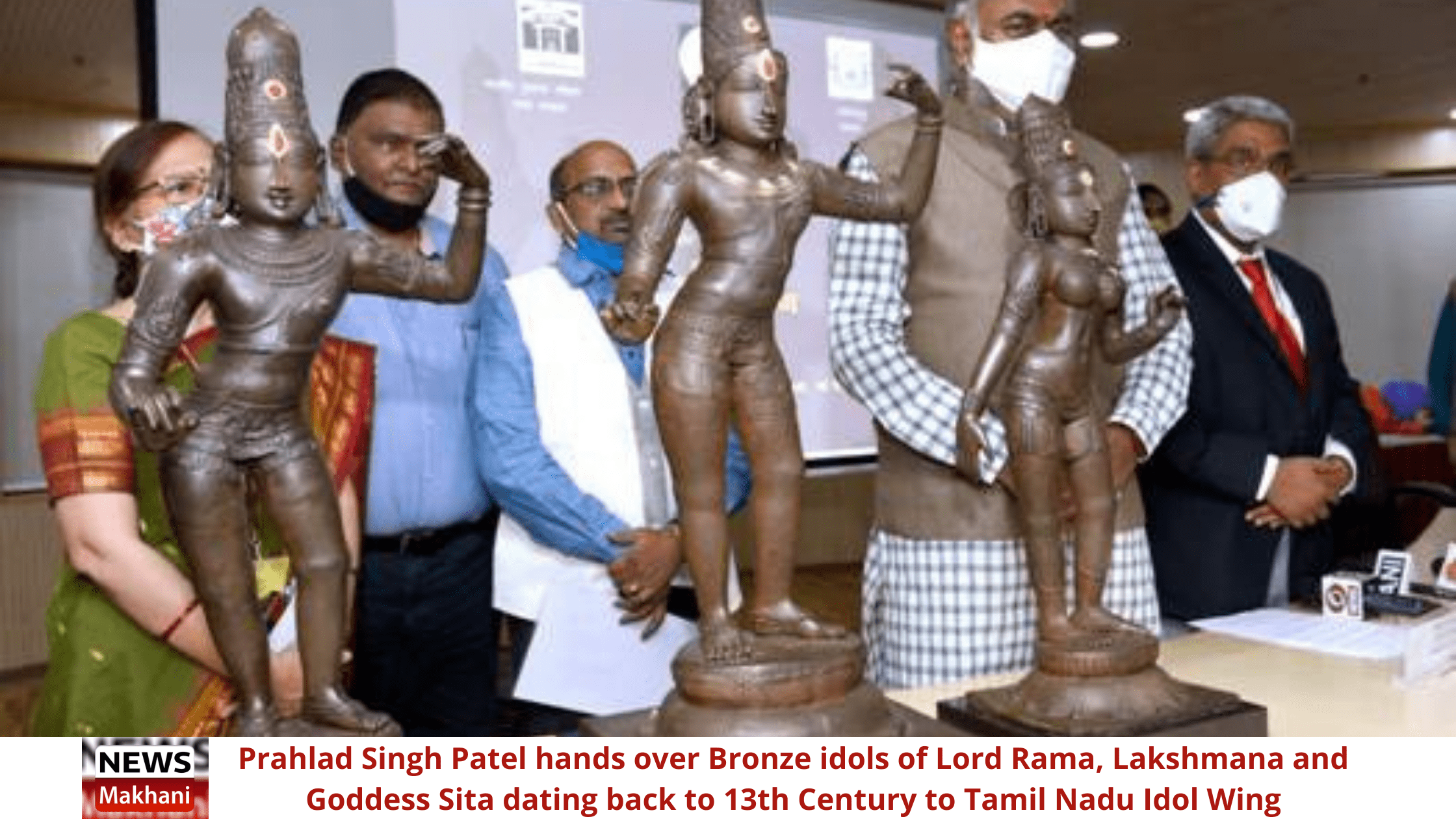 Union Minister of State for Culture & Tourism (I/C) Prahlad Singh Patel handed over the Bronze idols of Lord Rama, Lakshmana and Goddess Sita to Idol Wing, Government of Tamil Nadu at a ceremony held today in ASI Headquarters, Dharohar Bhawan in New Delhi. Senior officials from the Ministry of Culture, ASI and Government of Tamil Nadu were also present on the occasion.