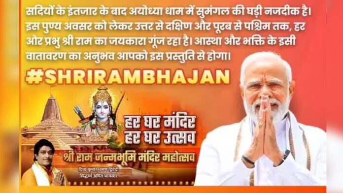 The Prime Minister, Shri Narendra Modi has shared devotional bhajan “Har Ghar Mandir Har Ghar Utsav” sung by Divya Kumar, music composed by Siddharth Amit Bhavsar. Shri Modi said that after centuries of waiting, the moment of auspicious time is near in Ayodhya Dham. On this auspicious occasion, the praise of Lord Ram is echoing everywhere from North to South and from East to West, Shri Modi further added.