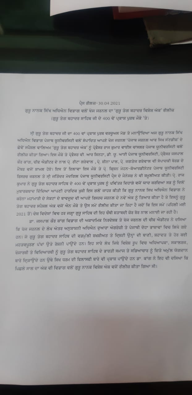 PU VC congratulated all on the 400th Parkash Utsav of Guru Tegh Bahadur Ji which is being celebrated all over the world. He appreciated the efforts of the team to bring out Research Journal’s special issue well in time despite the difficult situation due to Covid-19 Pandemic.
