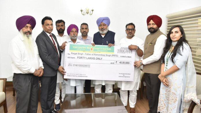 In a solemn gesture of support and institutional responsibility, the Punjab Finance and Transport Transport Minister Harpal Cheema, presented a compensation cheque of ₹40 lakh to the family of the late Ramandeep Singh, a conductor with the PEPSU Road Transport Corporation (PRTC) who tragically lost his life in the line of duty.