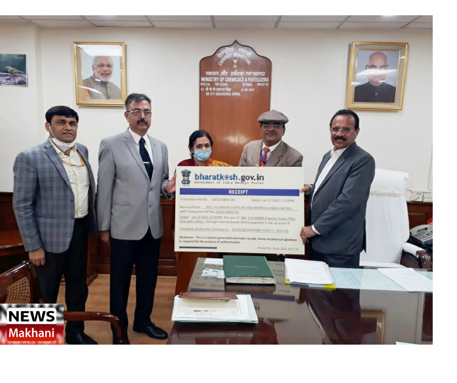 Union Minister of Chemical and FertilizersShriD.V.SadanandaGowda today received dividend receipt of Rs.12,51,00,000/-(Rupees Twelve crore fifty one lakh only)for FY 2019-20from Brigadier Amar Singh Rathore, CMD, FCI Aravali Gypsum & Minerals India Limited (FAGMIL). Shri Rajesh Kumar Chaturvedi, Secretary (Fertilizers) was also present during the occasion. Speaking on the occasion, Shri Gowda said that FAGMIL has been consistently paying dividend to the Government of India since last few years. In span of 17 years the Company has paid a cumulative dividend Rs.101.34 Croresi.e. 1382% of the initial paid up capital of Rs.7.33 Crore.He appreciated the results and growth achieved by the Company and expressed hope that the Company will grow exponentially and generate higher dividends in coming years. FAGMIL was incorporated on 14.02.2003 consequent upon hiving off Jodhpur Mining Organization (A unit of M/s Fertilizers Corporation of India (FCIL)). It commenced operations w.e.f. 01.04.2003 with an authorized capital of Rs.10 Crore and paid up capital of Rs. 7.33 Crore. During the year 2017-18 Company issued Bonus share capital of Rs.22.67 Crore (fully owned by Government of India) resulting in paid up capital of the Company increasing to Rs.30.00 Crore.